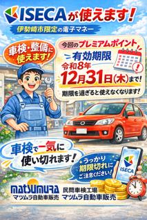LINE公式アカウントが出来ました 車検のご相談、修理の見積もり依頼など、にご活用ください。お友達登録後、車検証や修理箇所の写真などを添えてメッセージいただければ、すぐにご返信させていただきます。 車検・整備 グーピットページへ レビュー投稿はこちら 中古車販売 現在の在庫一覧へ レビュー投稿はこちら 最新情報 2026-03-03|お知らせ 伊勢崎市のみなさまへ🌷 ISECAは車検にも使えます。 期限は12月31日までです。 ISECAが使えます! 当店は、伊勢崎... 続きを読む 2026-02-27|お知らせ 【「なが〜く保証」に入っていて本当に良かった・・・】 「なが〜く保証」に入っていて本当に良かっ... 続きを読む 2026-02-20|お知らせ 【自動車保険に入っていて本当に良かった…】 〜実際にあったお客様の声〜 先日、前橋市... 続きを読む バックナンバー 株式会社 マツムラ自動車販売